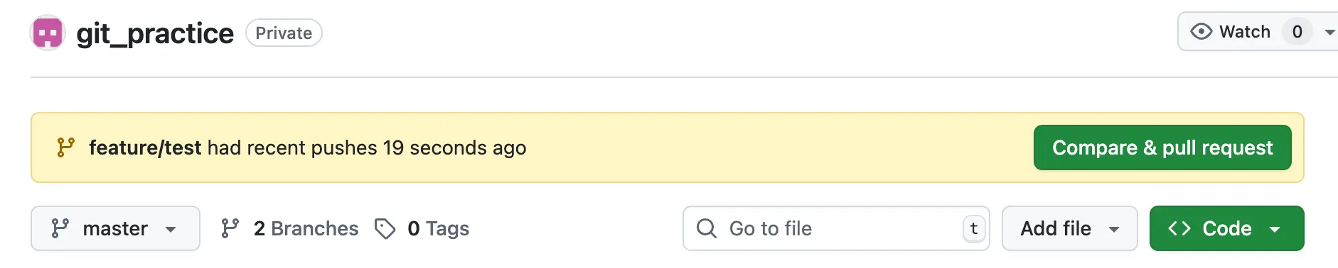 새로운 branch에 commit이 올라오게되면 GitHub에 아래와 같은 Pull Request 알림이 노출됩니다.