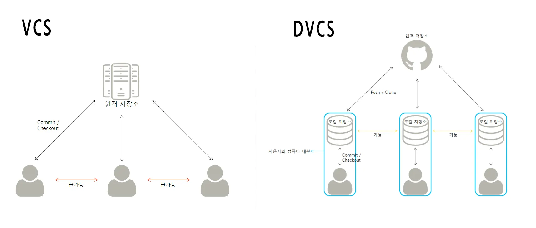 모두 중앙 서버가 없으면 코드를 관리할 수 없는 중앙 집중식 시스템입니다. 이와 반대로 Git은 중앙 서버가 없어도 동작합니다. 이를 구분하기 위해 Git은 DVCS(Distributed VCS, 분산 VCS)라고 합니다.