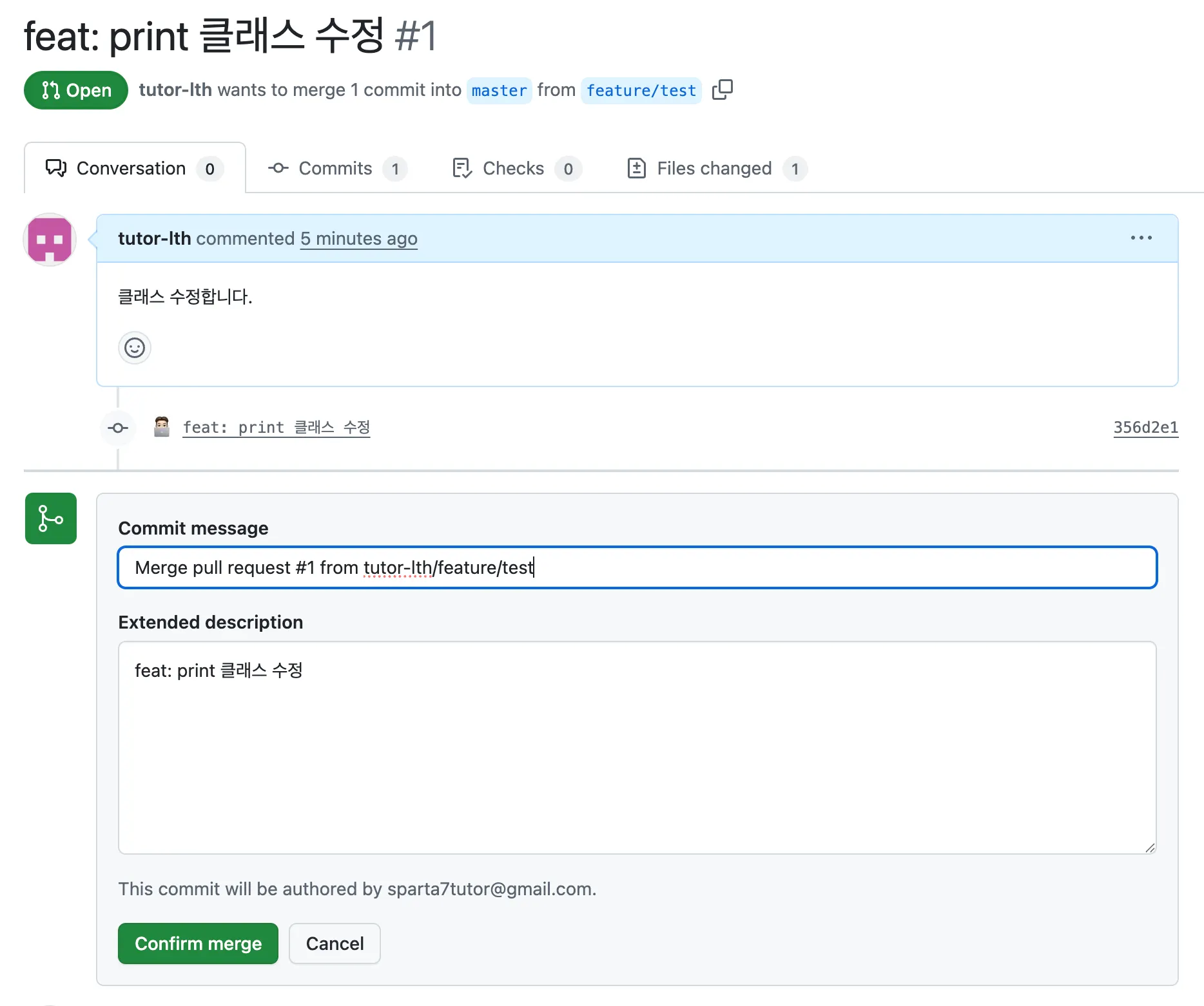 아래와 같이 PR이 생성 된 후 충돌이나 소스에 문제가 없다면 Merge pull request를 통해 master 브랜치에 feature/test 브랜치 소스를 병합합니다.