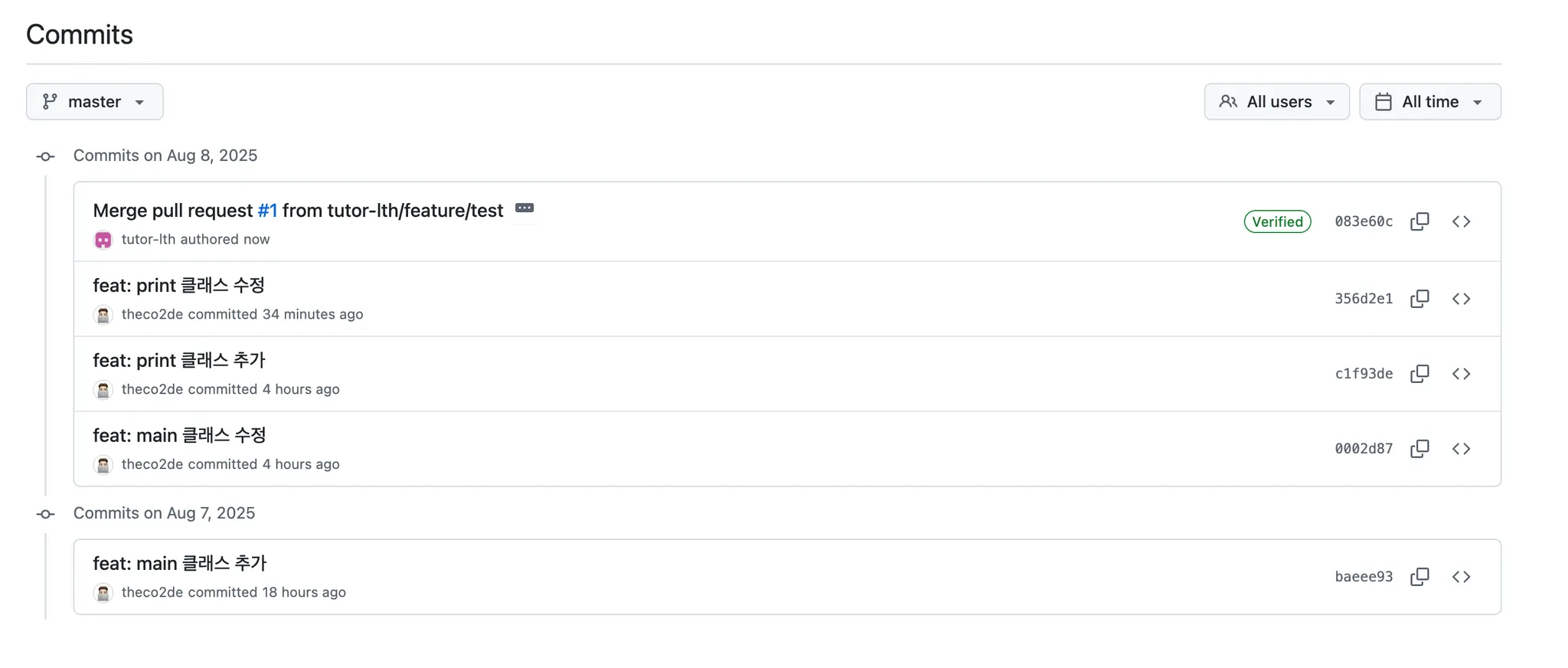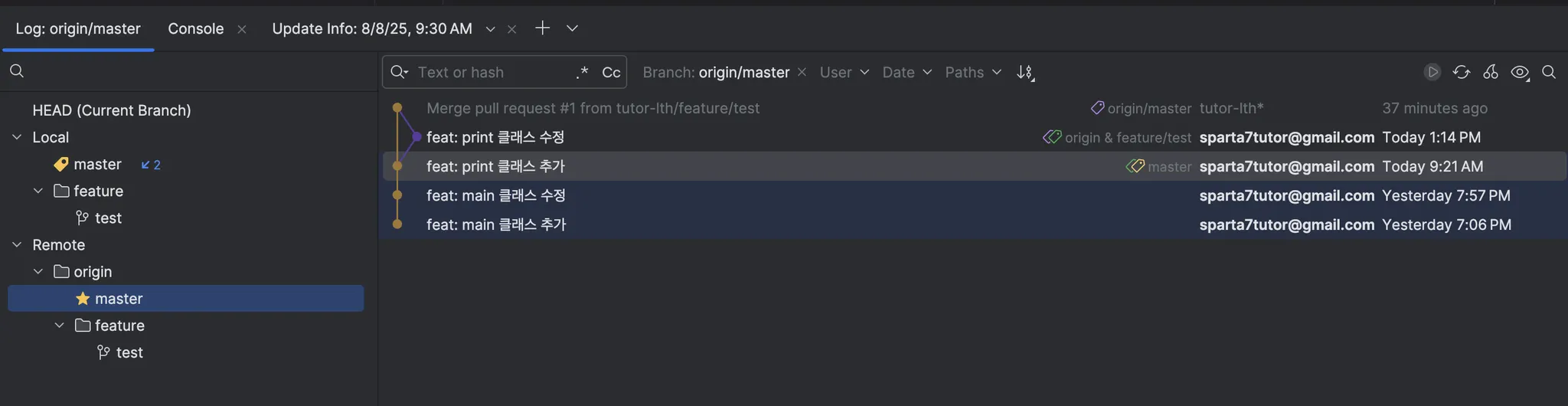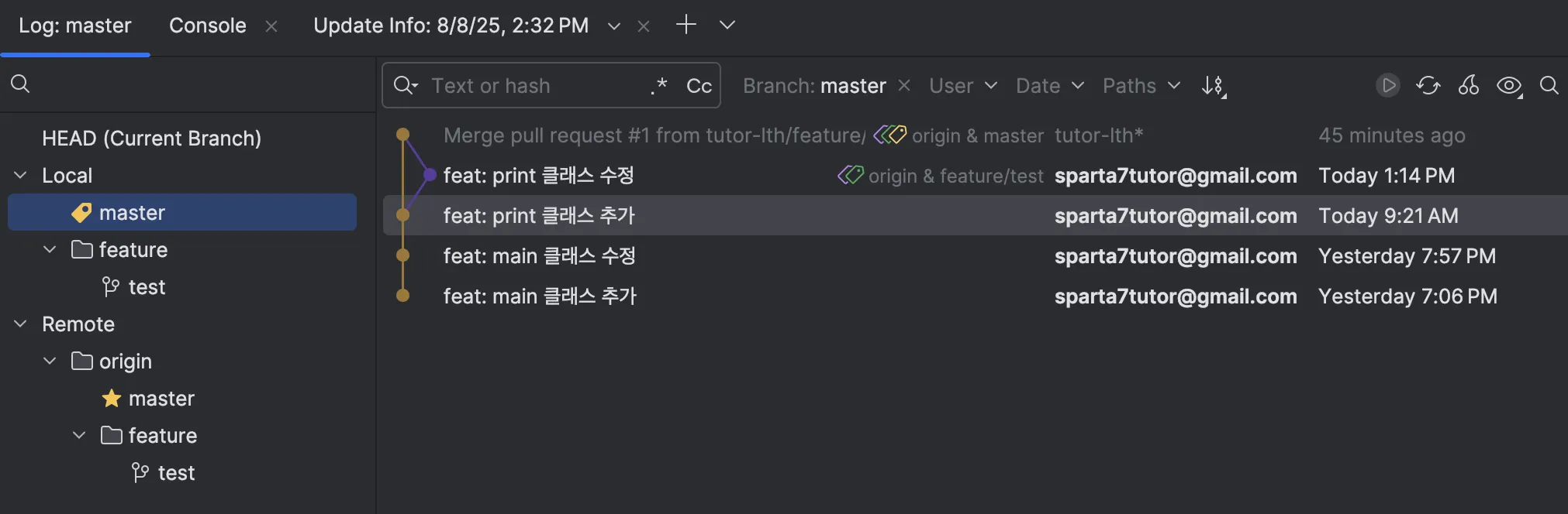 앞선 PR로 GitHub에 master branch에 feature/test branch 소스가 병합되었습니다.