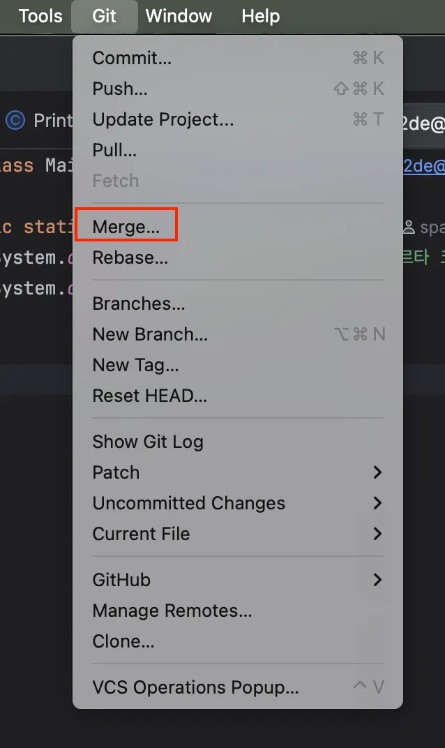 현재 브랜치에 다른 브랜치의 변경사항을 합치는 명령어입니다.
