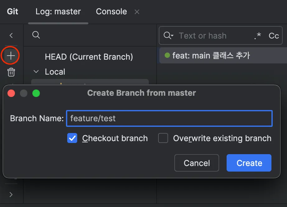 master에 병합할 feature/test branch를 선택 후 merge 합니다.