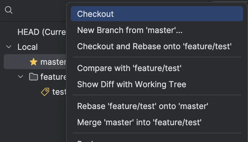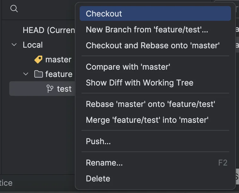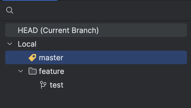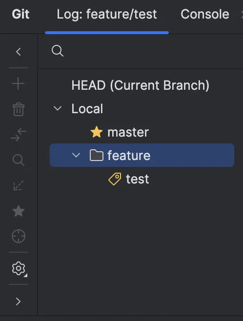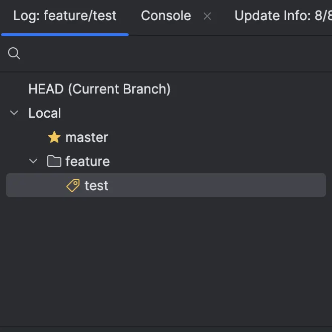 현재 fetch를 하지 않은 상태이기 때문에 remote/origin > feature/test만 생성된 상태이고 아직 commit 목록을 가져오지 못했습니다.