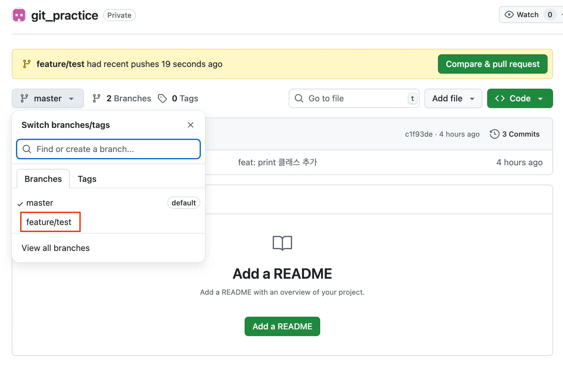 push한 feature/test 브랜치와 commit 내역이 github에 추가되었습니다