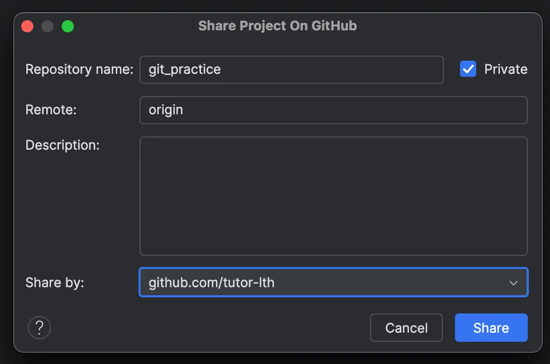 Share by : 어떤 github 계정 사용할 것인지 선택