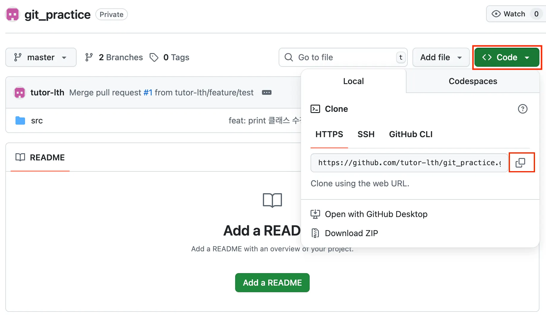 이때, clone 명령어를 사용하여 local에 복사합니다.