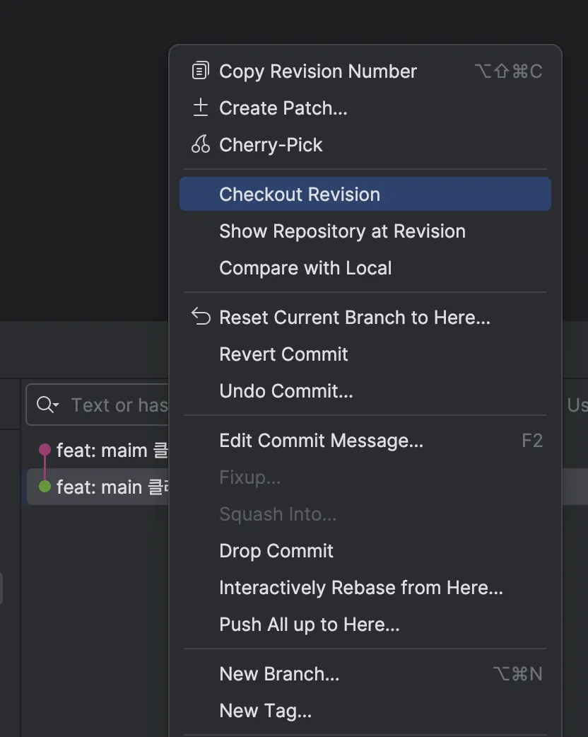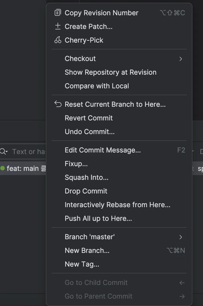 tree에 특정 commit을 우클릭 하면 아래와 같은 메뉴가 나타납니다.
