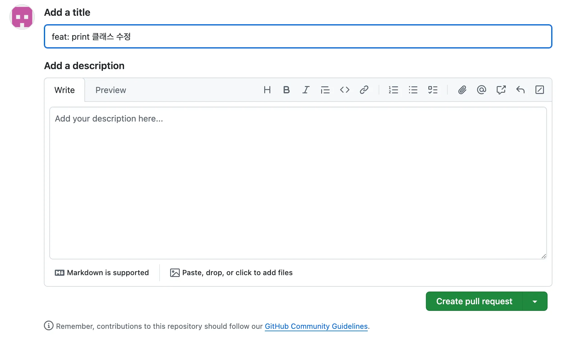 PR 제목과 내용을 작성 후 Create Pull Requset하면 PR이 생성됩니다.