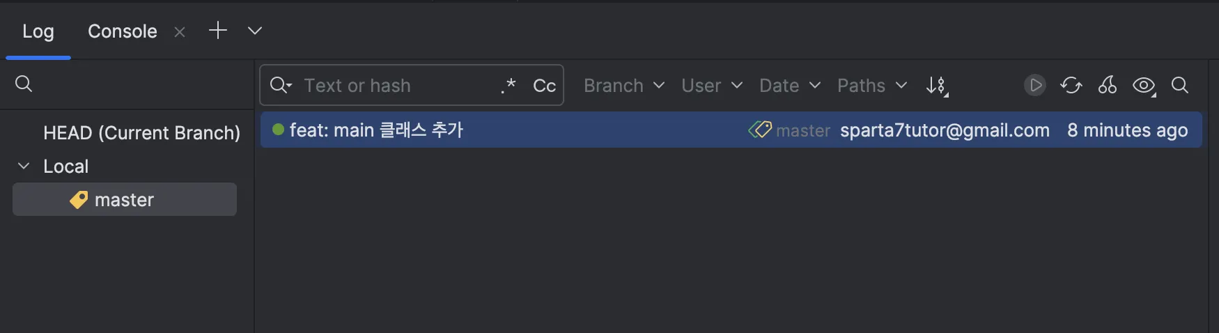 git log에 노란색 마크가 표시 되어 있는 것이 현재 branch를 뜻합니다.