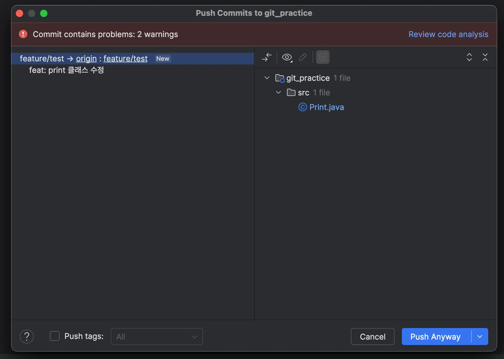 추가 및 수정한 소스를 확인 후 Push Anyway를 클릭